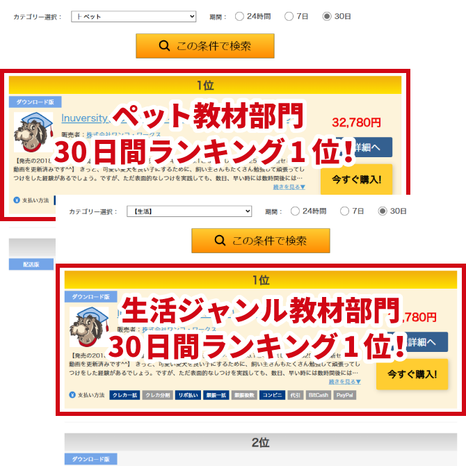 ペット教材部門全57教材・生活ジャンル教材部門全1350教材にて6冠達成!